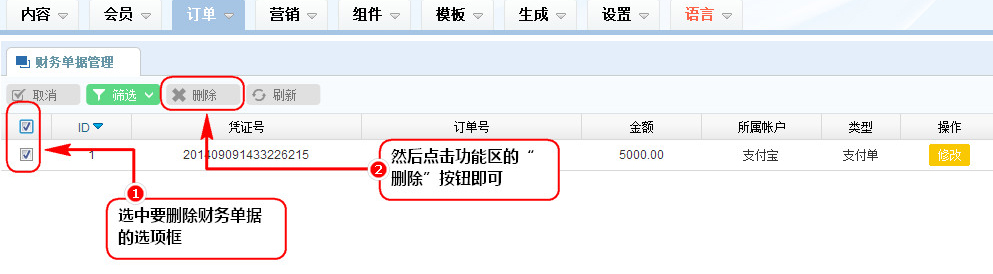 1、在財務(wù)單據(jù)列表管理區(qū),選中要刪除財務(wù)單據(jù)的選項框;
