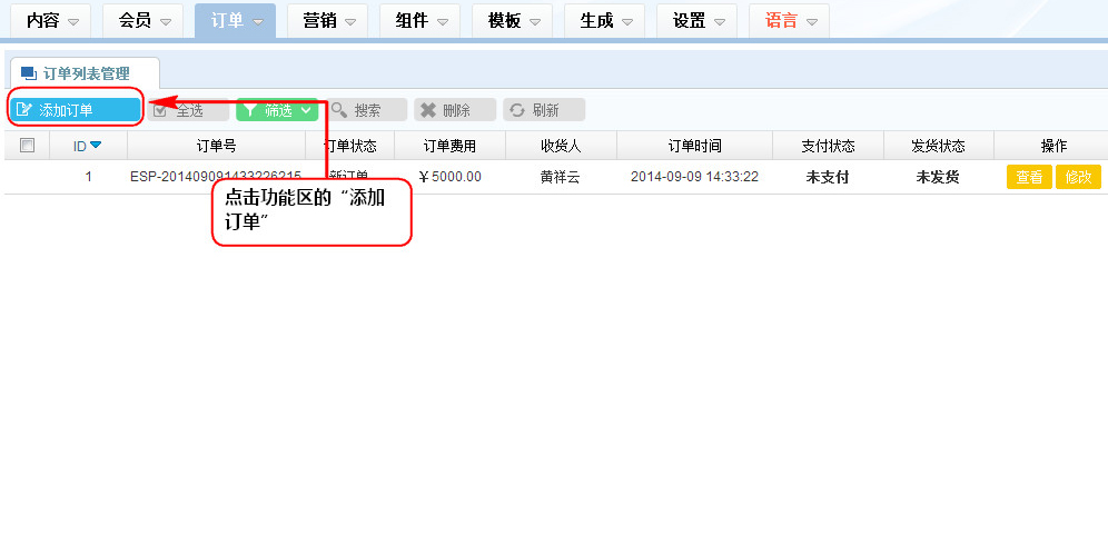 3、說(shuō)明:此訂單添加屬于附加功能,具體添加訂單最好由用戶(hù)在前臺(tái)自行進(jìn)行。