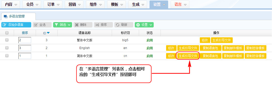 1、在“多語(yǔ)言管理”列表區(qū),點(diǎn)擊相對(duì)應(yīng)的“生成引導(dǎo)文件”按鈕即可;