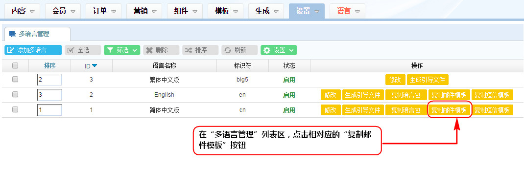 1、在“多語言管理”列表區,點擊相對應的“復制郵件模板”按鈕;