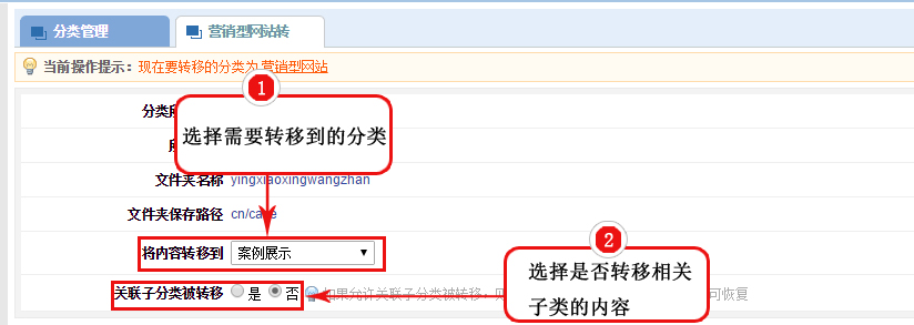 3、說明:單頁分類不允許轉移;列表分類不能向單頁模型分類中進行轉移;