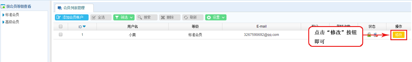 1、在會(huì)員列表管理區(qū),點(diǎn)擊需要修改會(huì)員列表區(qū)的“修改”操作按鈕,或者雙擊需要修改的會(huì)員列表區(qū);