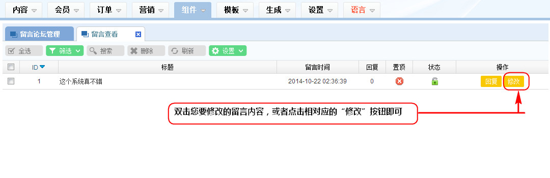 1、在“留言查看”列表區(qū)雙擊您要修改的留言內(nèi)容,或者點擊相對應的“修改”按鈕即可;