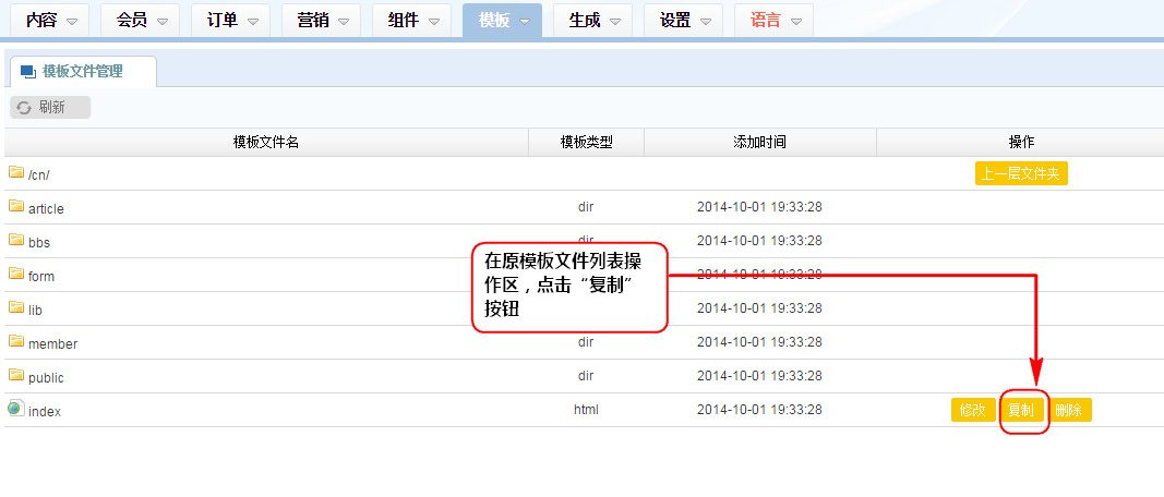 1、在模板文件列表區(qū),在原模板文件列表操作區(qū),點擊“復制”按鈕;