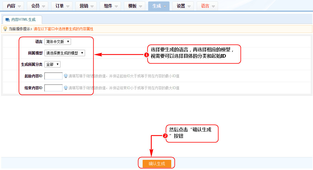 具體操作方法為:選擇要生成的語言,再選擇相應(yīng)的模型,視需要可以選擇具體的分類和起始ID,然后點擊“確認(rèn)生成”按鈕。