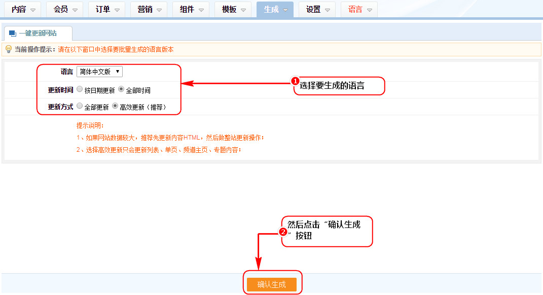 說明:如果網(wǎng)站數(shù)據(jù)較大,推薦先更新內(nèi)容HTML,然后做整站更新操作,選擇高效更新只會更新列表、單頁、頻道主頁、專題內(nèi)容;
