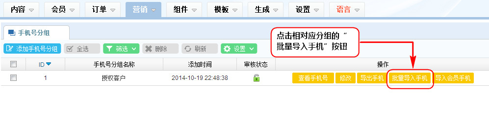 1、在手機(jī)號(hào)分組列表區(qū),點(diǎn)擊相對(duì)應(yīng)分組的“批量導(dǎo)入手機(jī)”按鈕;