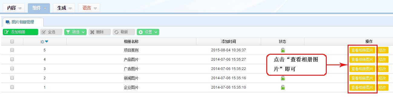1、在“圖片相冊管理”窗口區,點擊要查看相冊列表操作欄的“查看相冊圖片”按鈕;