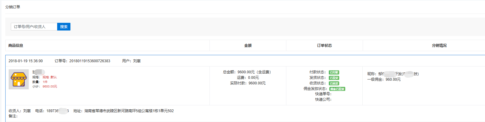 有了分銷商之后,分銷商通過轉發,推廣海報推廣小程序,當他們的下線產生交易額的時候,就會產生傭金,這些訂單為分銷訂單,在該頁面顯示 ;分銷訂單管理顯示所有分銷訂單信息,包括訂單基本信息, 以及分銷商傭金信息,可根據訂單號或者下單用戶搜索