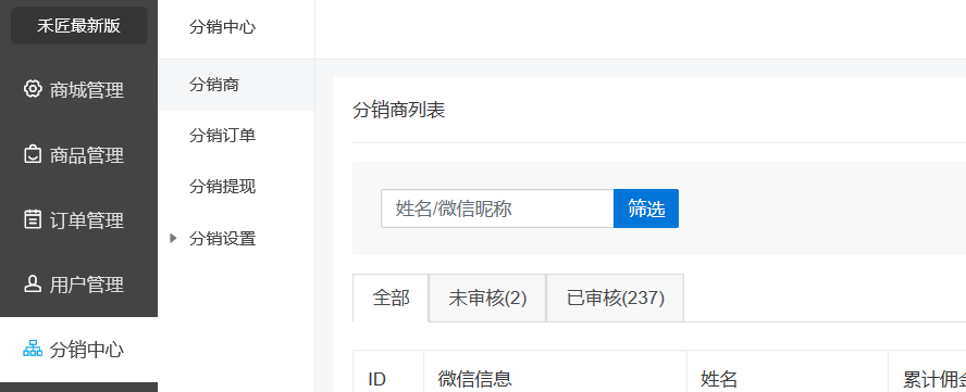 設置好小程序,用戶在小程序端申請成為分銷商或者已經成為分銷商之后,所有分銷商在該頁面進行管理