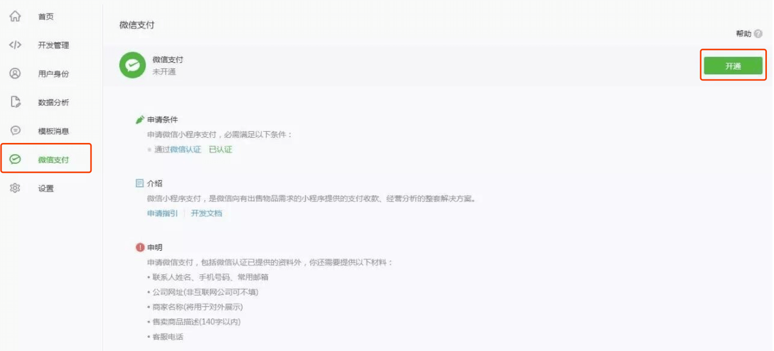 操作路徑:登錄微信小程序后臺 -> 微信支付 -> 開通,進入后請按照微信的指引操作。注意:如果是通過公眾號快速注冊的小程序,開通微信支付的時候可以服用公眾號支付資質
