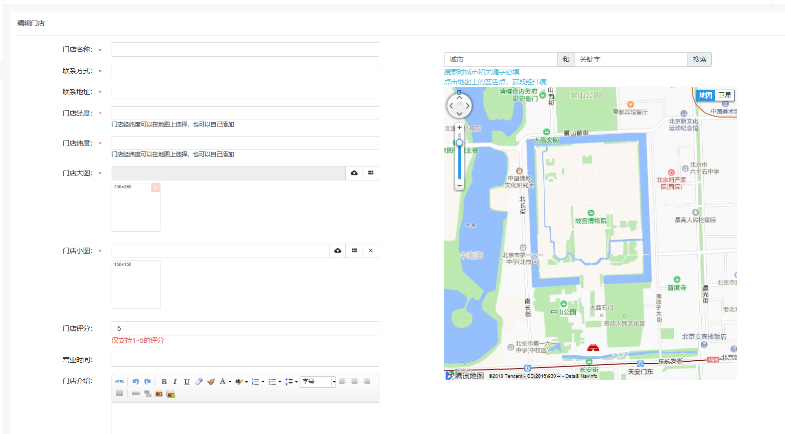 填寫門店基本資料,上傳門店圖片 定位地圖(地圖使用先填寫城市跟關鍵字進行搜索,然后點擊藍點,左邊經緯度出現則為設置好),也可以自己在其他地圖,例如百度,谷歌,高德地圖等搜索到經緯度,自己填入