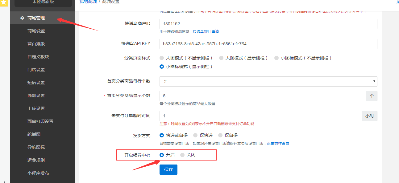 1:商城設(shè)置-開(kāi)啟優(yōu)惠券