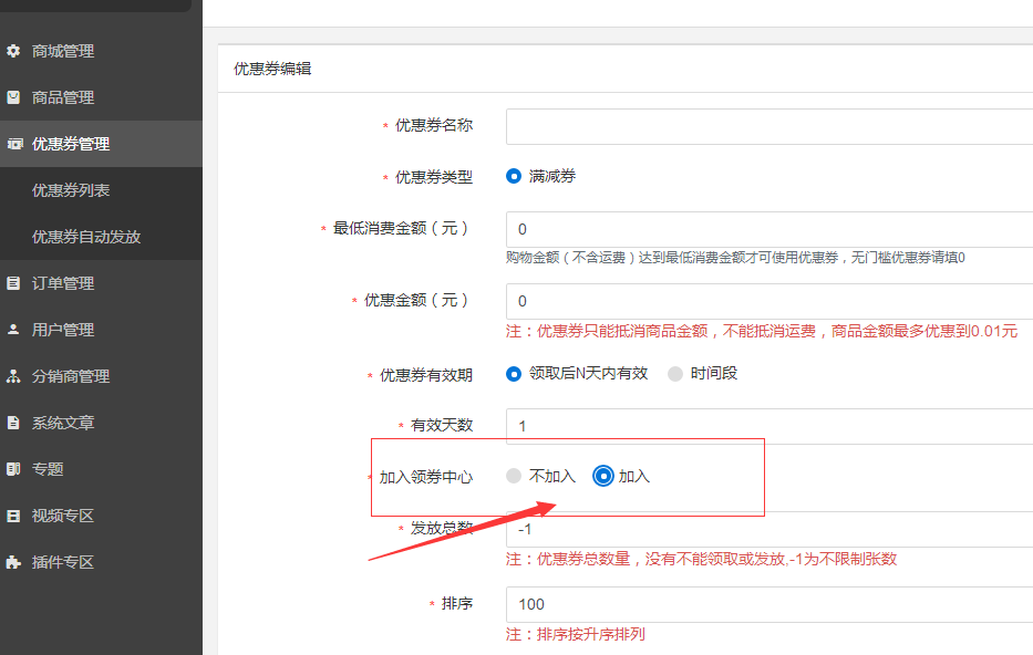 3:添加優(yōu)惠券加入領(lǐng)券中心